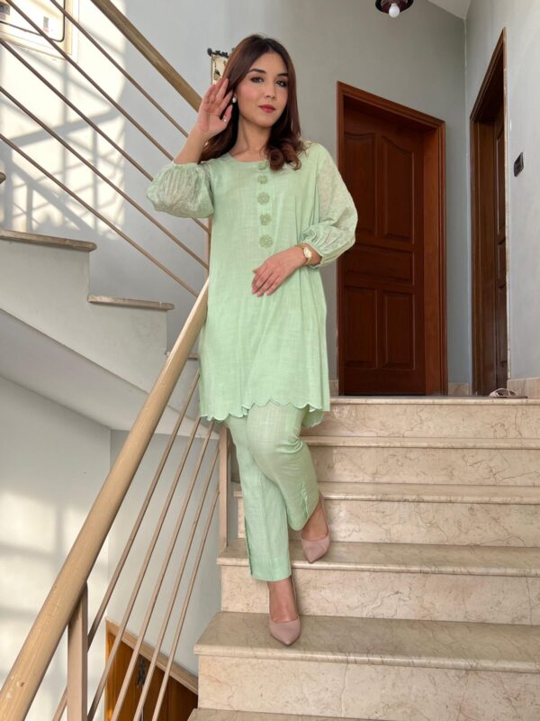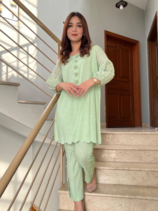 Light green Irish lawn outfit enhanced with 3D florals on neckline