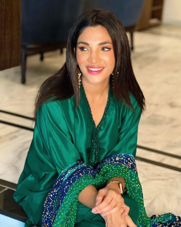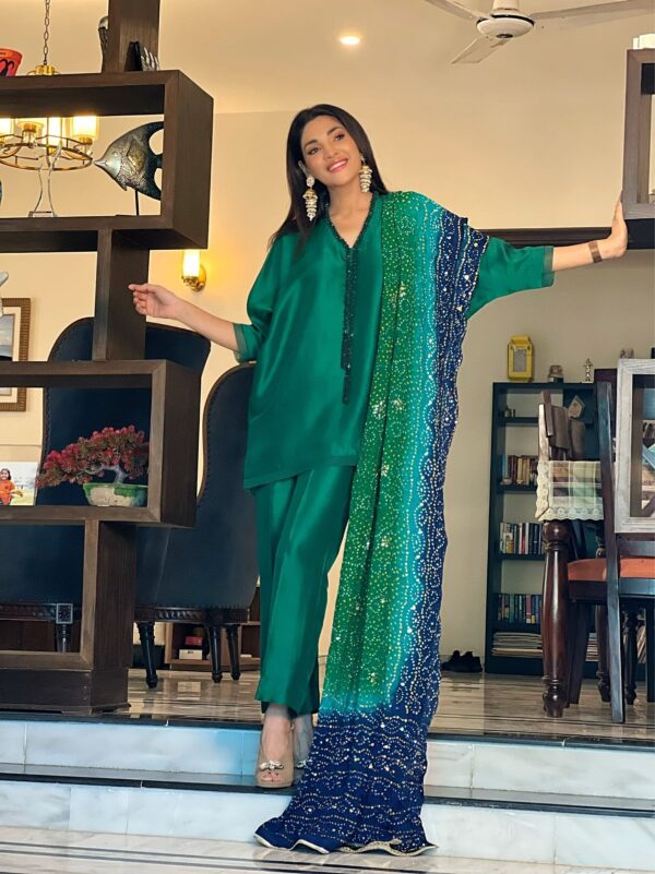 Pure raw silk outfit embellished with emerald green beads long necklace.