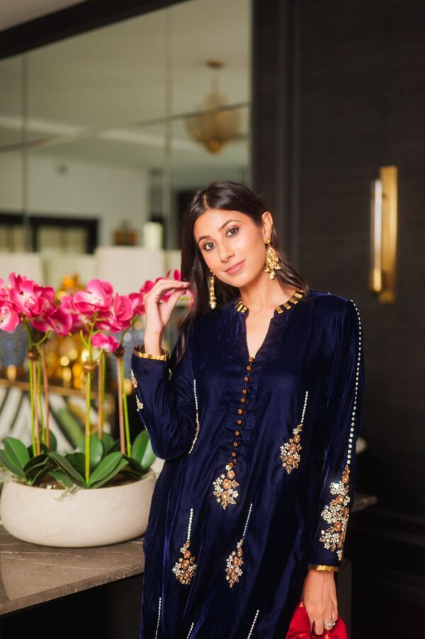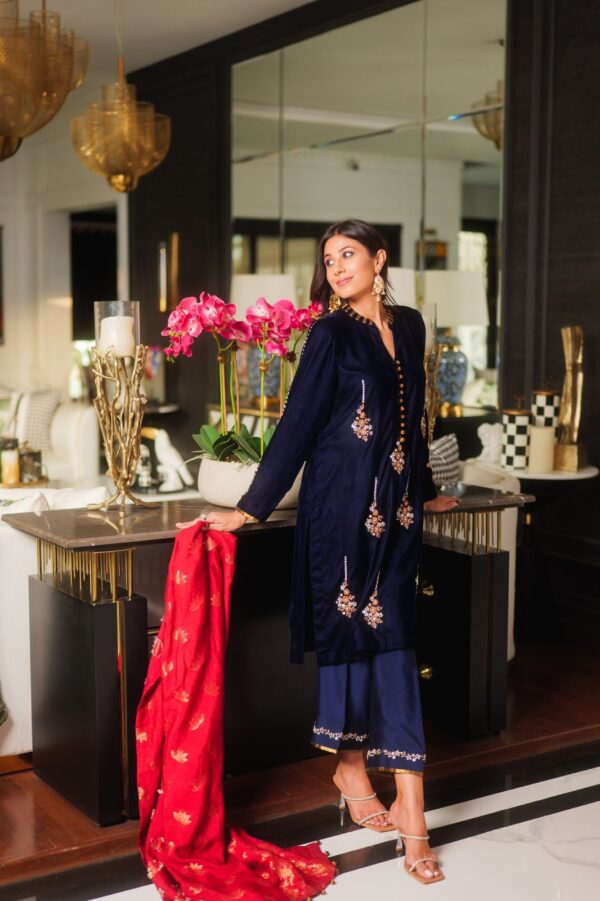 A formal navy blue velvet ensemble that is modern, classy and effortless….the look is paired with embroidered cullots…with maroon banarsi dupata enhanced with tilla balls