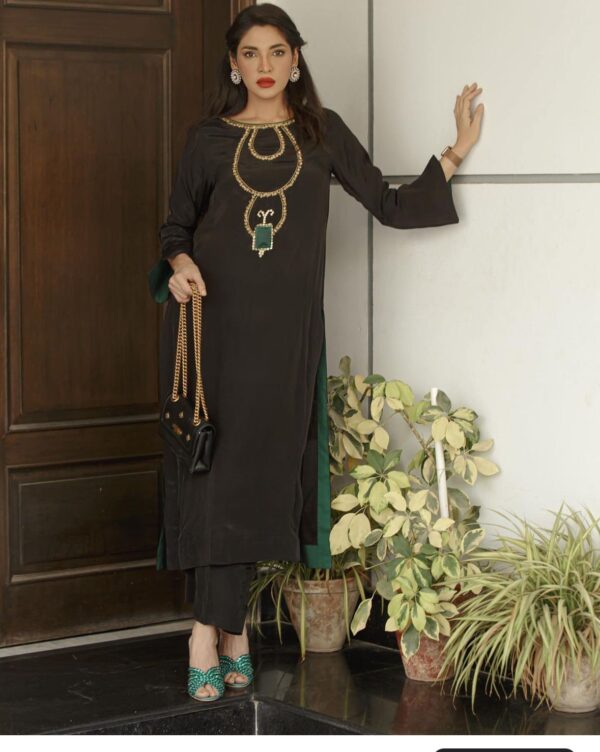Featuring black finest silk shirt with intricate hand work with gold sequins and dabka with beautiful emerald green stone paired with black pants