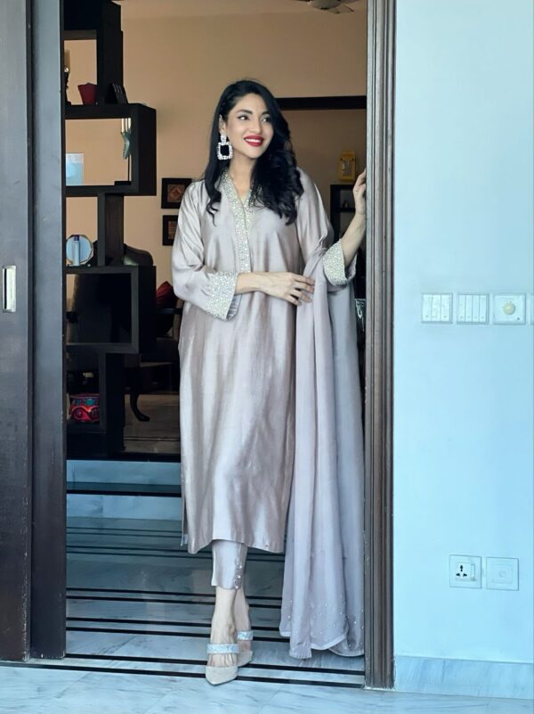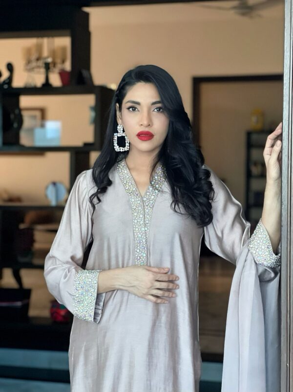 Pure khadi silk outfit embellished with multi colored Swarovski crystal on neckline and sleeves with medium silk dupata with crystal chan on palu