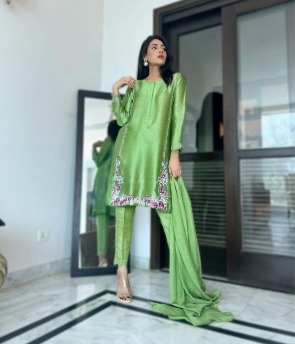 Featuring intricate multi color embroidery on finest silk paired with matching pants with lace compliment with silk dupata to give festive look on coming eid