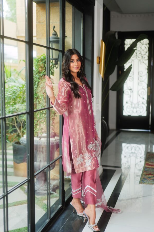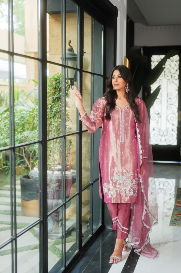 Excude elegance this festive season in tea pink tissue shirt embroidered with flora on daman with net kamdani dupata with cutwork lace further enhance the look.