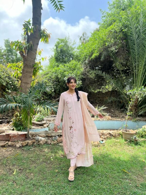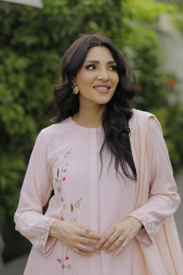 Light pink georgette outfit with machine embroidery paired with med silk dupata with lace finish